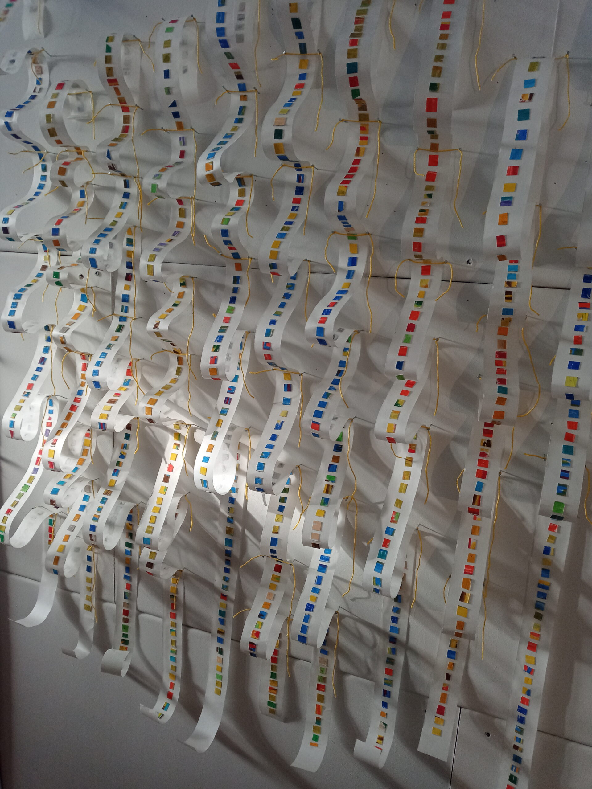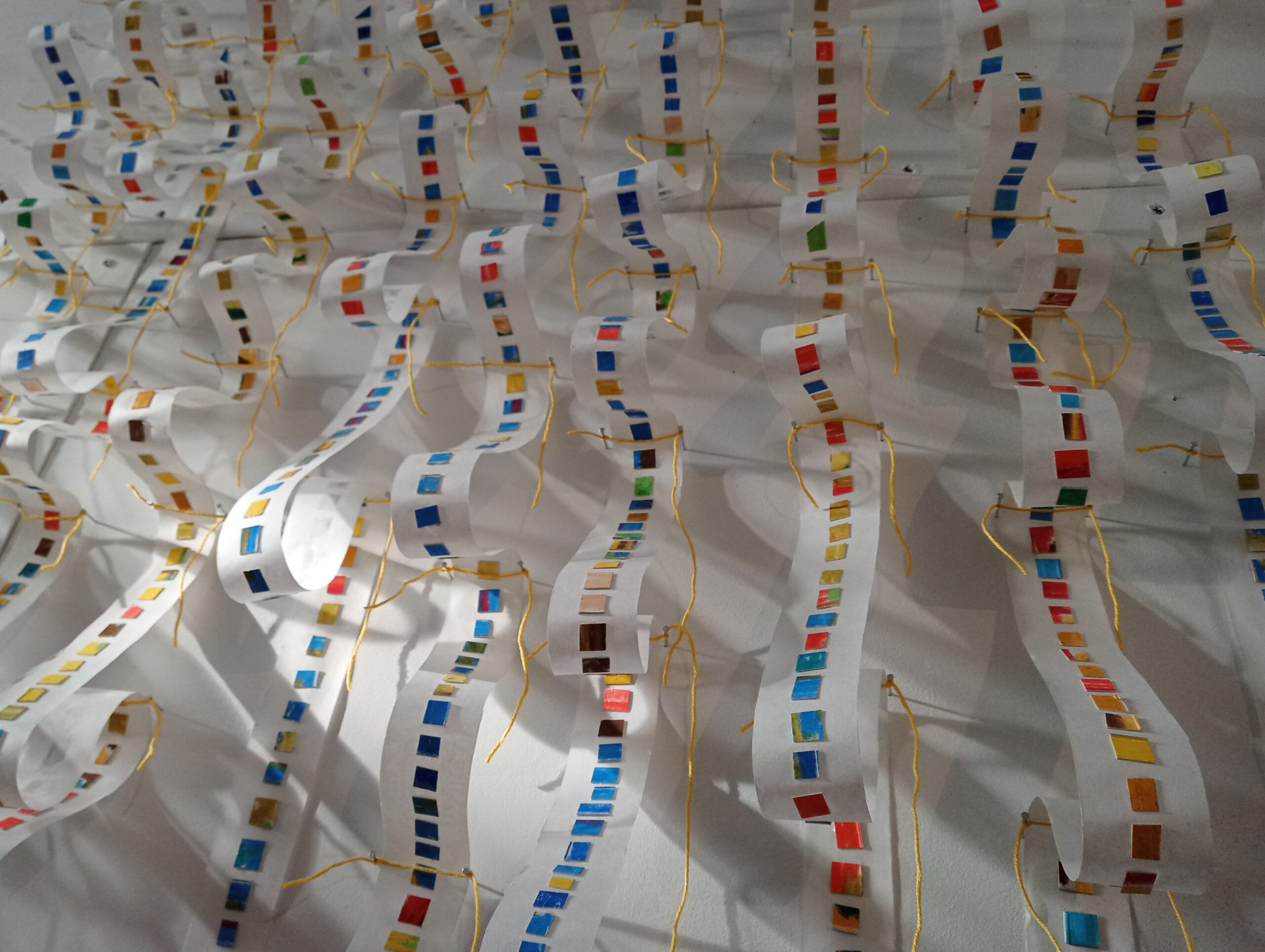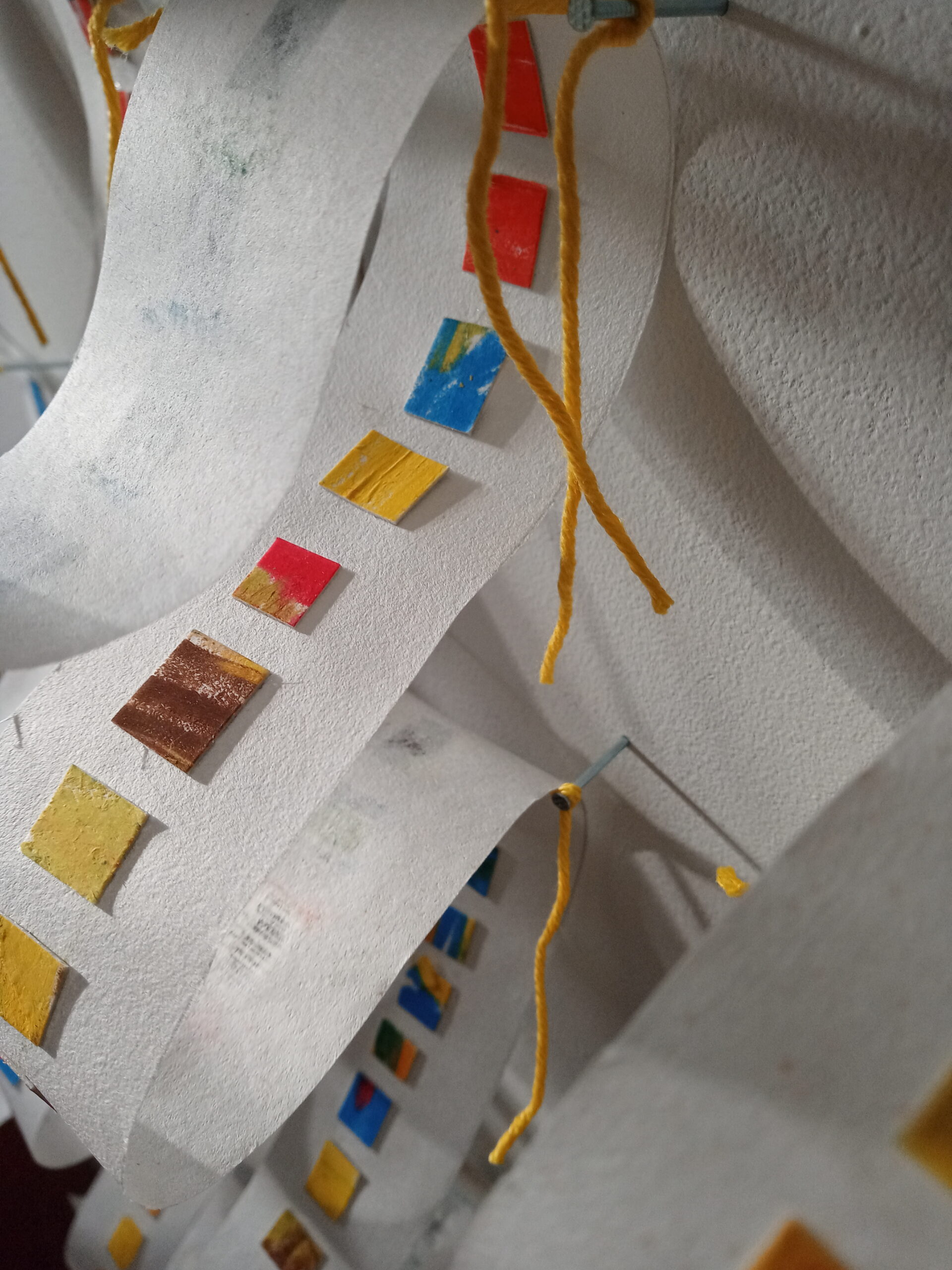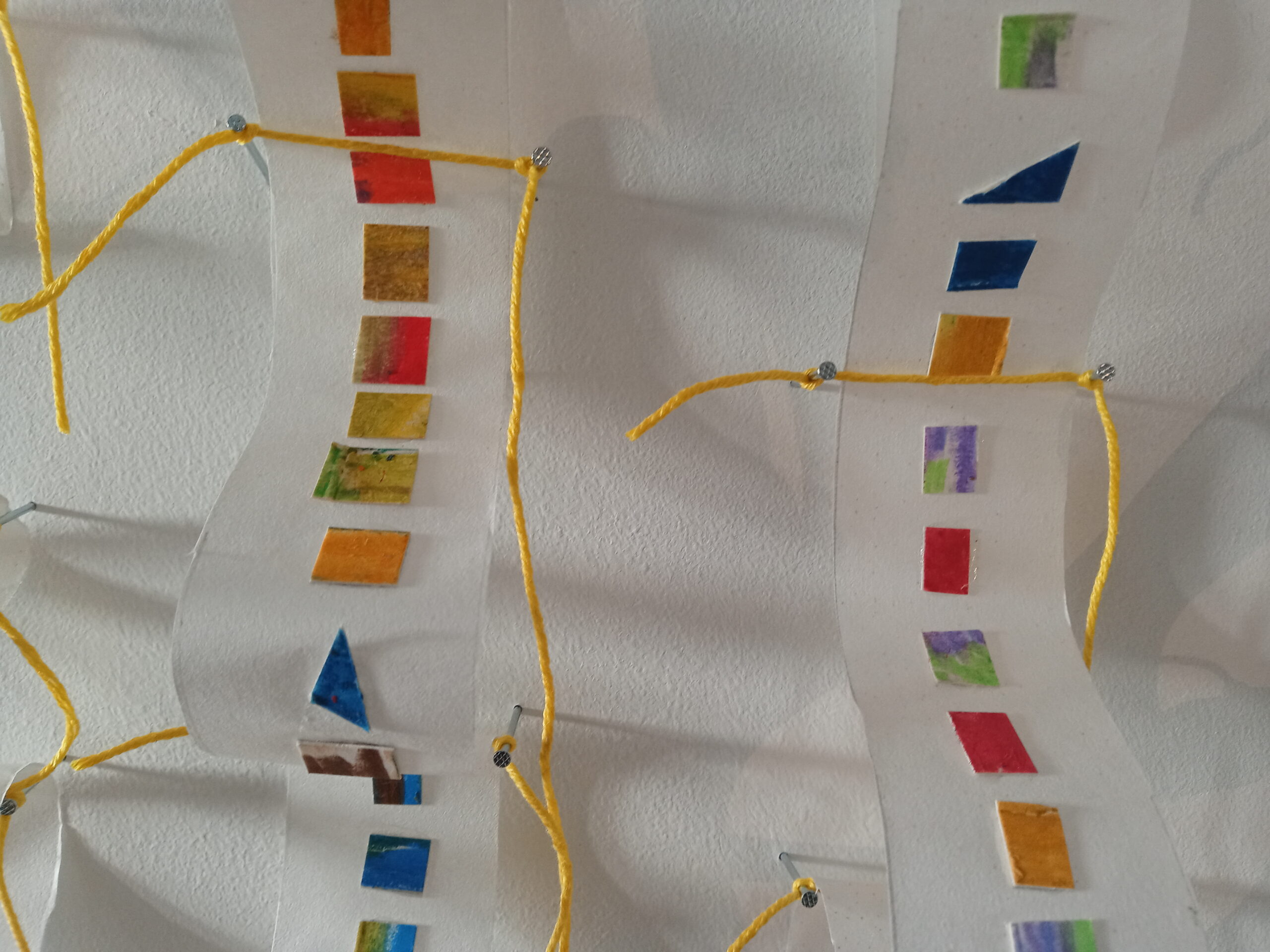 DANCES started from cuttings from empty tea boxes glued on rice paper and has since then taken different forms. The thus created Tape rolls move between the walls and the yellow threads, never being tied to a place.
