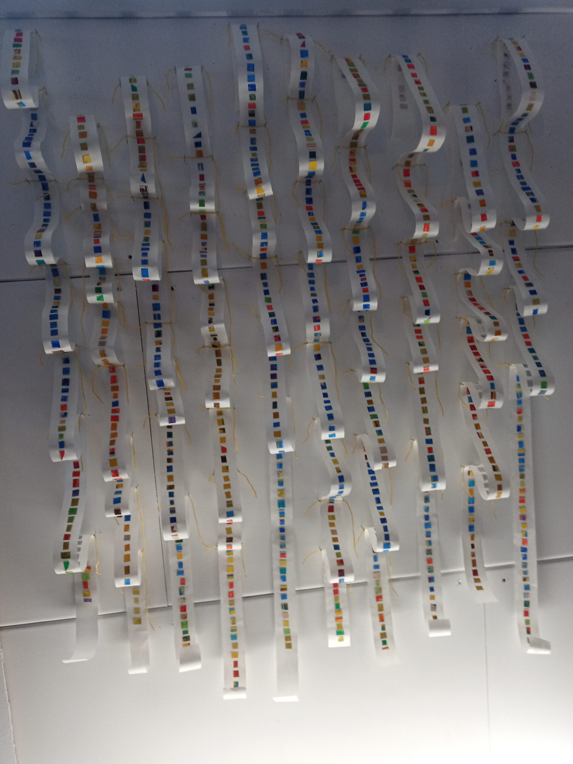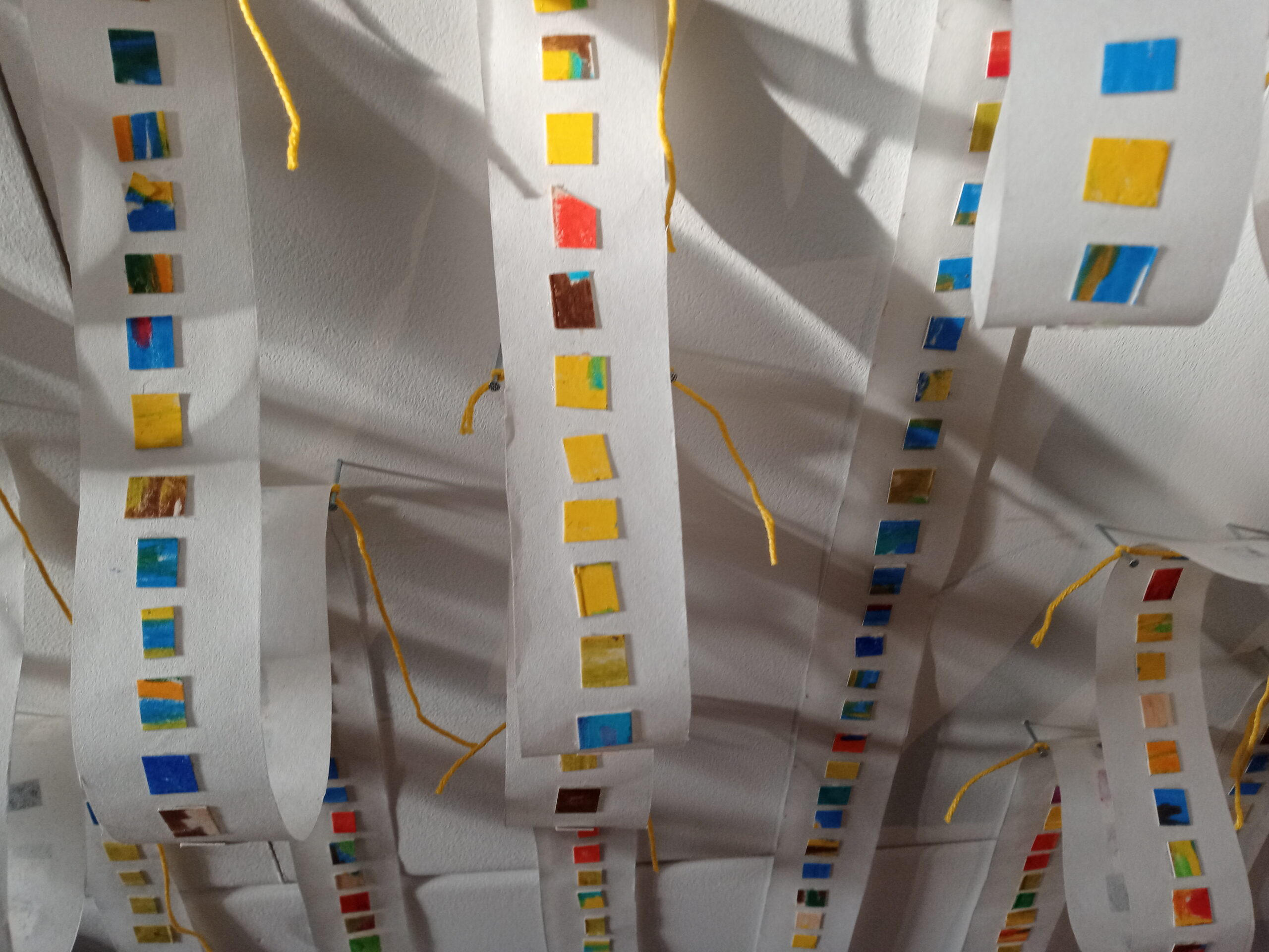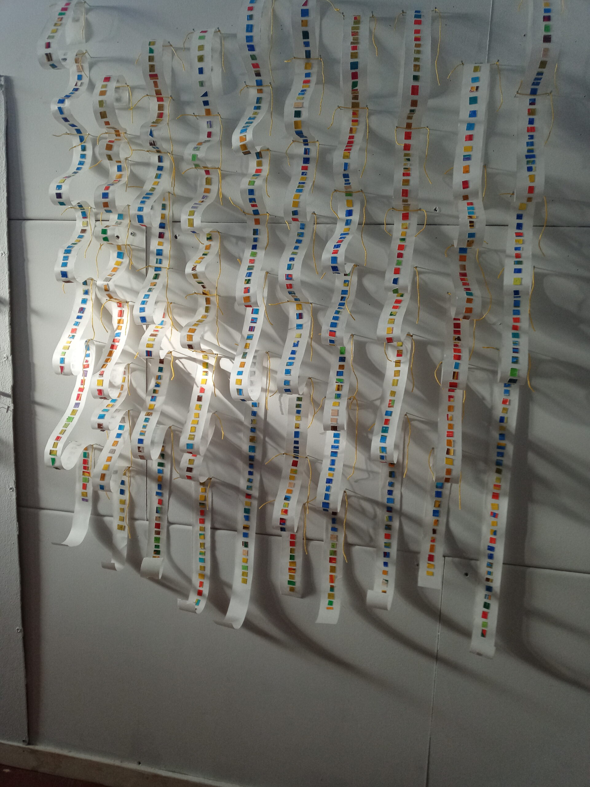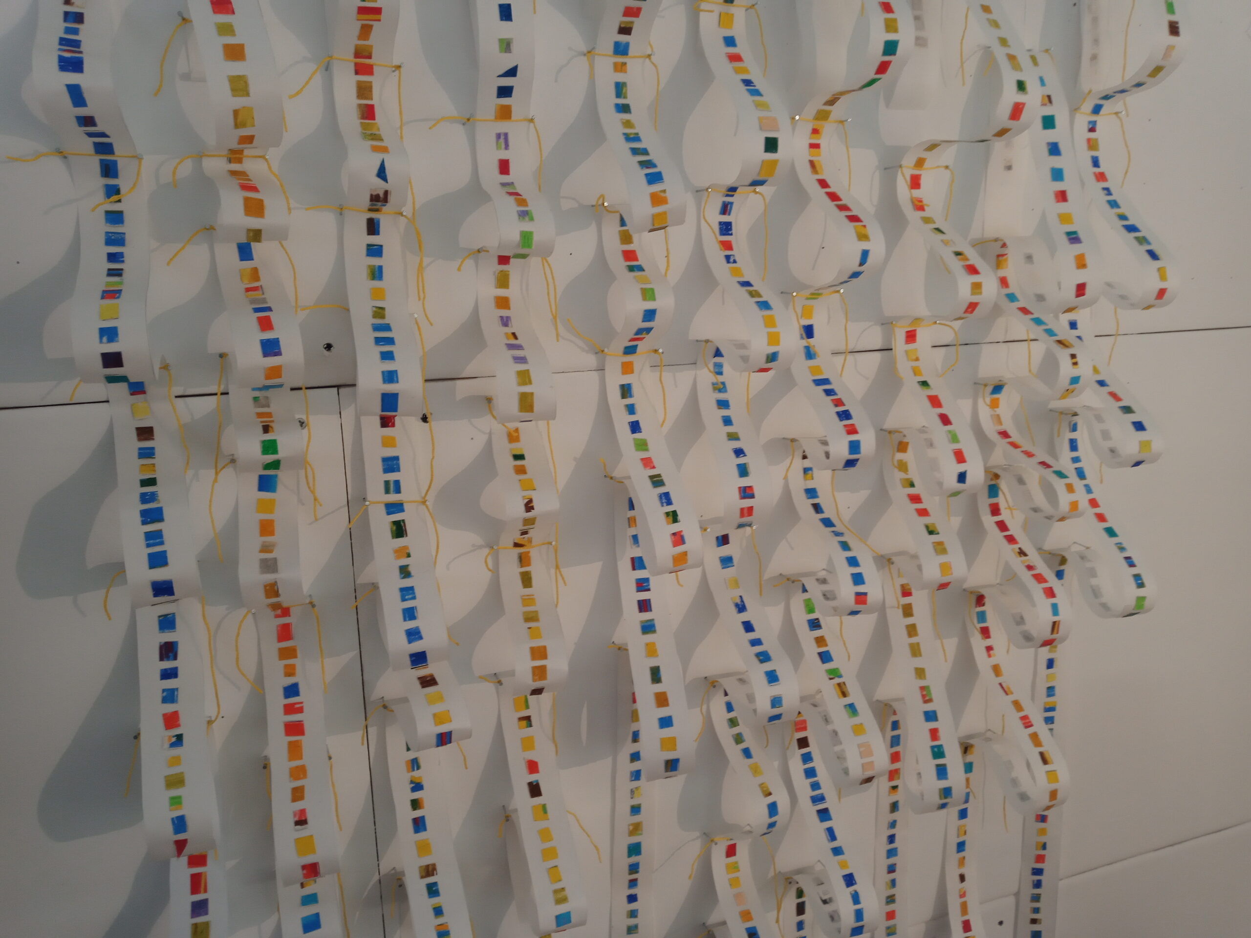 DANCES started from cuttings from empty tea boxes glued on rice paper and has since then taken different forms. The thus created Tape rolls move between the walls and the yellow threads, never being tied to a place.